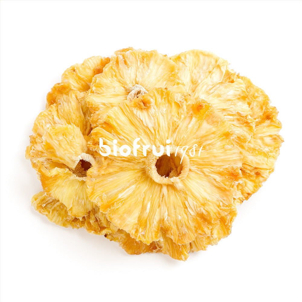 Biofrui1981 vous propose des rondelles d'ananas de variété Cayenne Lisse séchées à basse température, biologiques et équitables, sans sucre ajouté, sans additif, sans conservateur, Végan, Raw (qualité crue), sans gluten, sans lactose. Disponible en vrac ou en sachet éco-conçu refermable.